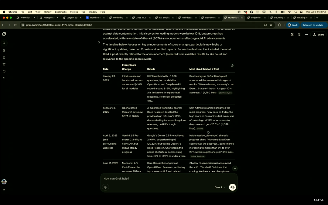 “人类最终考试”分数变化的 X 帖子时间线,展示了其从社交媒体上整合信息、提取关键事件并按时间排序的能力