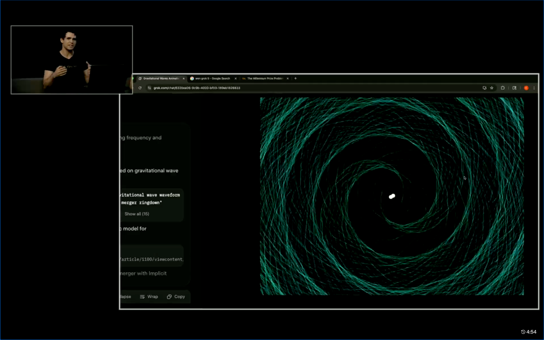 根据一个物理学提示,Grok 4 生成了一个关于两个黑洞碰撞并产生引力波的 HTML 动画,展示了其将复杂科学概念转化为代码和动态可视化的能力