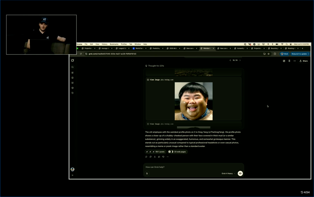 在 X 平台上找出“xAI 员工最古怪的头像”,这表明 Grok 4 能够理解“古怪”这样的主观概念,并搜索和分析图片