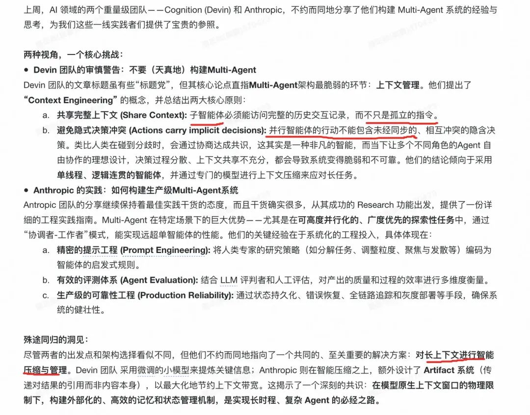 考虑后续我们承接的业务场景暂时不需要很发散的需求,采用层级指挥模式进行多智能体协作设计。 通过手撸React框架,以及对多智能体协作的调研,发现了一些问题,其实本文上述中在每个章节都有提到上下文管理。 如果无脑做ToolCalls调用,带来的问题有: 1.烧token; 2.无关信息可能会导致每个agent调用时产生幻觉; 如果agent获取到的上下文不够或者确实,带来的问题有: 1.产出质量较低,导致指挥者可能发生多次无用的调用指挥; 2.agent并行执行时,agent之间的上下文通信能力不足,类似于神经网络中陷入局部最优解; 因此,在多智能体升级完以后,我们也会考虑设计上下文动态压缩、合理使用文件系统等工作。 查询了一些资料,发现有些资料中的观点与我提到的基本类似,可以参阅: