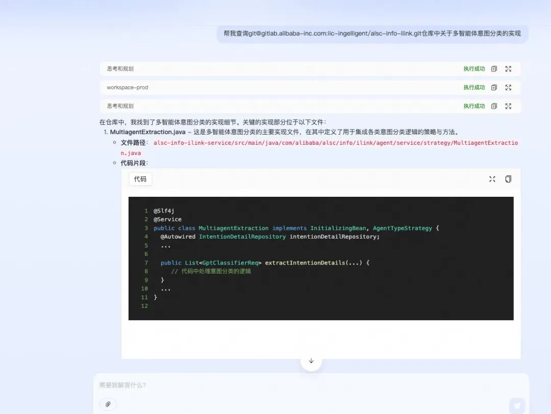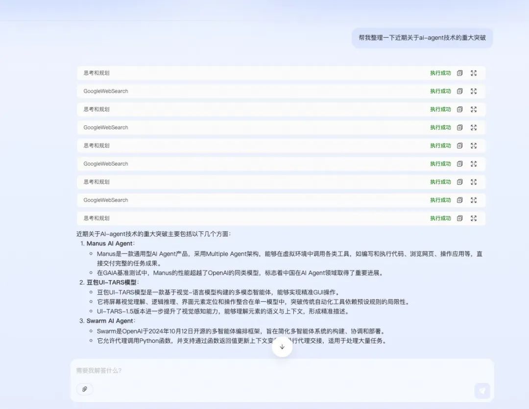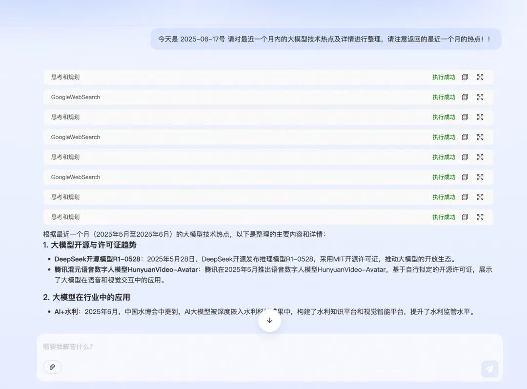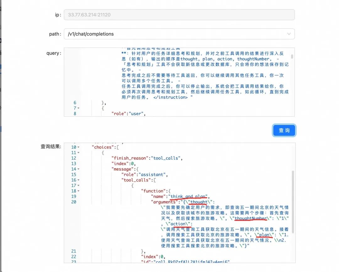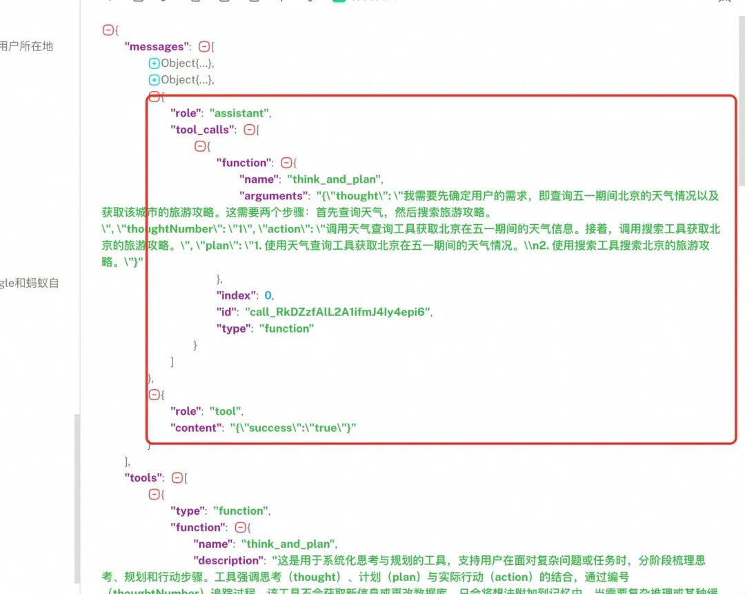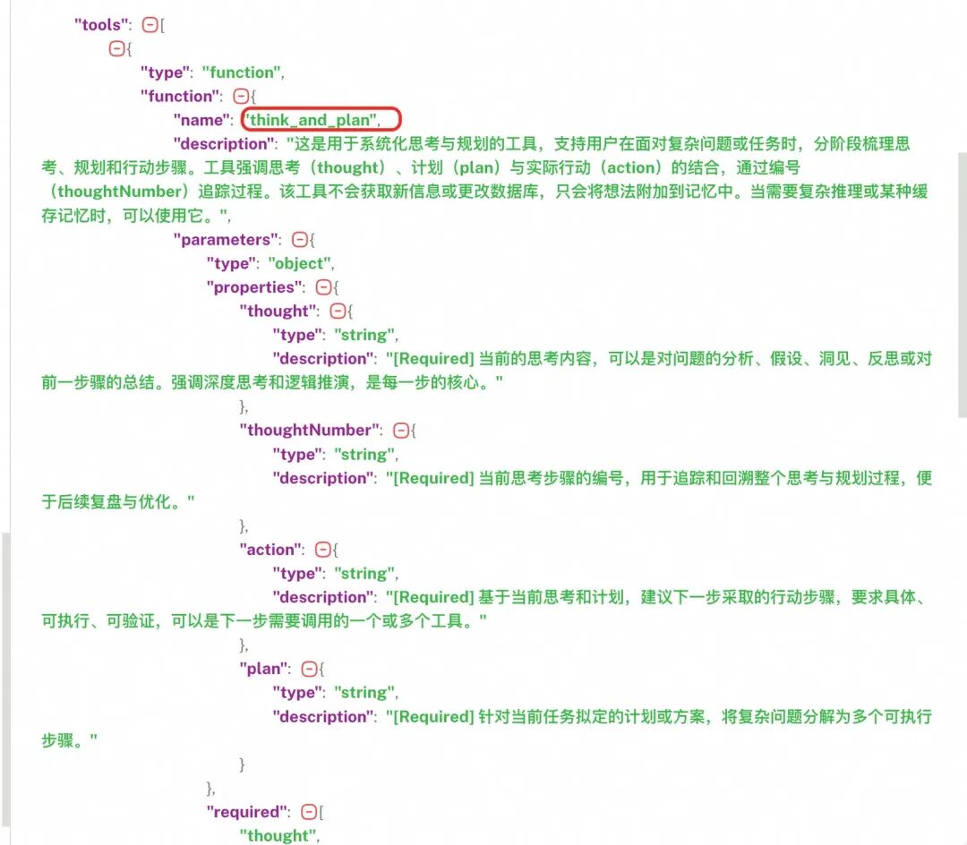 3.第一步回答出需要调用的工具是思考工具,借助思考工具定义的入参,让大模型给到思考内容、规划内容,实际该方法只是一个空壳,然后拼接大模型的回答和工具调用的结果,思考规划工具的调用结果手动mock为success。