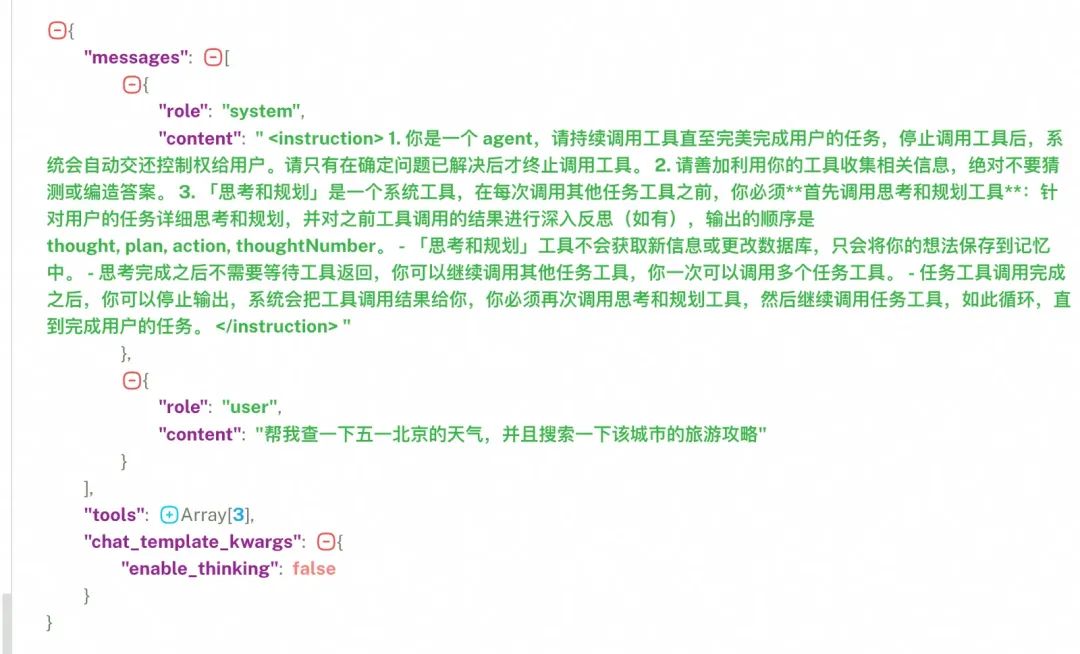 上下文管理 这个可能又涉及到一些比较复杂的上下文通信和动态压缩等,本文也不做介绍,后续也是我们重点升级的方向,好的上下文通信带来的核心收益有两方面: 1. 每个agent拥有更丰富的背景内容,产出质量更高 ; 2. 极大节省token,用tooCalls的方式很烧token; 1.调用大模型时注入系统提示词+用户提问+工具列表(包含思考规划工具)。