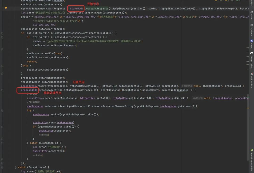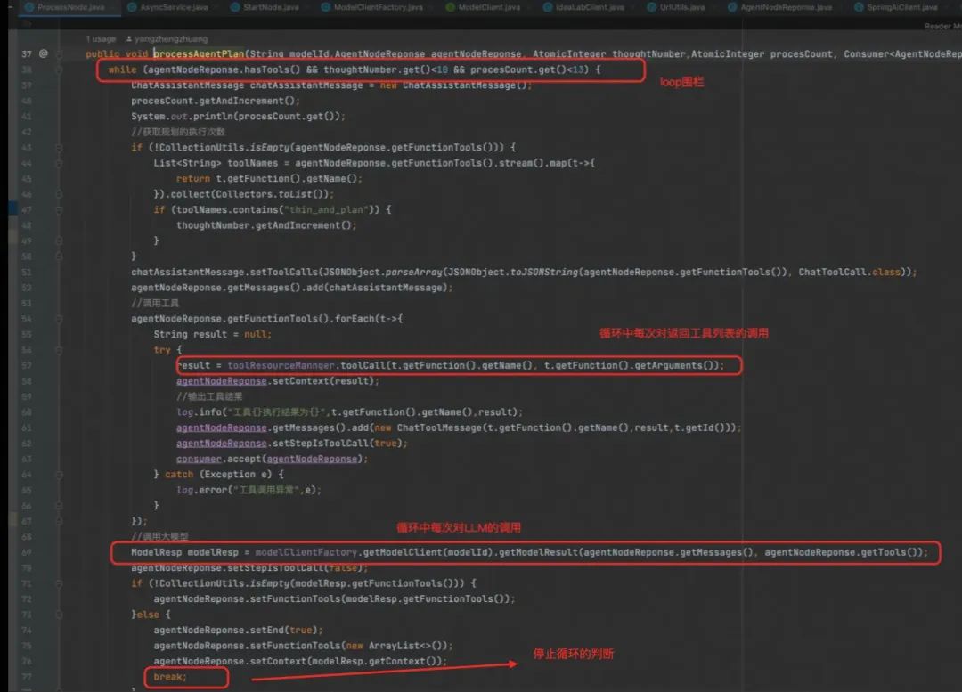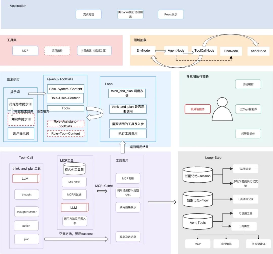 1.agent分类方面,此前我们已经有了流程编排类型、其他平台api接入类型、RAG+角色扮演类型。此次扩展出一种规划类型agent。 2.在环境方面,我们针对长期记忆和短期记忆分别进行持久化。 a.长期记忆主要指多轮对话,补充一次会话过程中的背景信息; b.短期记忆是每个智能体或工具给出的回答,用于:1.后续实现单agent间的通信 2. 记录思考次数,以便做异常中断; c.agent绑定的工具列表持久化,其中有一个作用是,gpt4做toolCalls时,仅支持方面名是英文的方法,因此还要利用这块的存储做中文-英文的缓存; 3.规划过程: a.领域抽象时,设计了五个Node来完成核心流程; b.startNode,用于组装系统提示词、RAG检索到的片段、用户提示词、历史对话、用户提问、工具列表; c.startNode节点中调用LLM,收到反馈; d.ProcessNode节点负责循环过程的执行,需要获取LLM返回的参数,去拼接LLM的message内容、以及循环中发起对工具列表的调用; e.ToolManagerNode ,负责接收需要调用的方法名及入参,根据方法名,在cache中查找对应的MCP的sseUrl利用mcp客户端调用工具获取结果,添加到LLM的message中; f.StepNode,负责对每一步结果进行打标,并存储到短期记忆中; g.SendNode 负责接收来自processNode的数据,并进行封装,如背景中的各个步骤执行效果,需要用和前端约定好的标签封装过程数据。然后对封装好的数据利用Ssemitter进行发送; 4.LLM客户端封装 a.针对LLM调用,主要是根据不同平台对模型的支持程度,封装了三个LLM-ToolCalls的客户端; b.whaleSdk、Idealab-http调用、springAI框架调用; c.根据用户配置的模型id,来适配找出一种客户端做模型调用; 整个实现流程图如下,与上述描述基本一致: