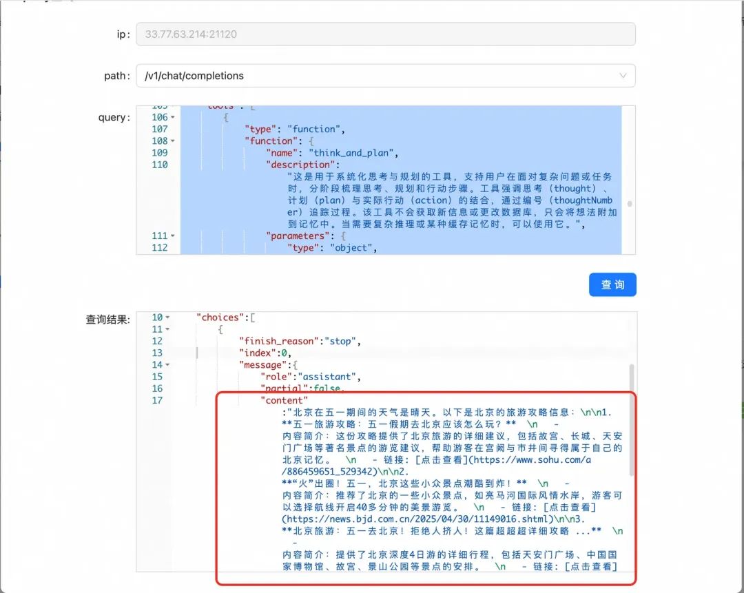 5.重复2-4的过程,直至大模型返回的tool_calls为空,content不为空时结束,最终结果如下: