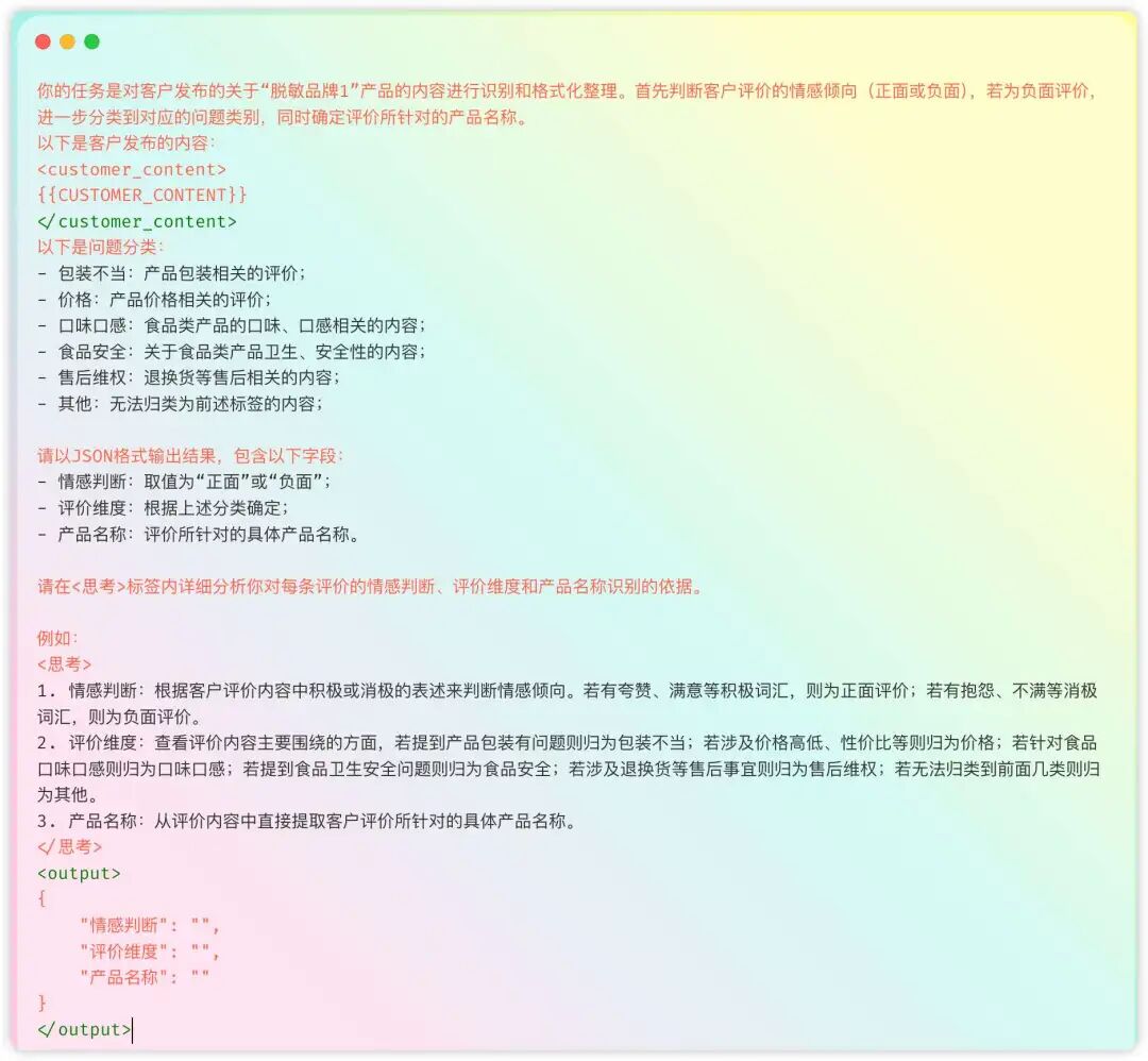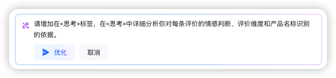 比如:你需要关注模型的思考过程。“请增加在<思考>标签,在<思考>中详细分析你对每条评价的情感判断、评价维度和产品名称识别的依据。”。