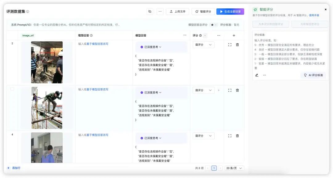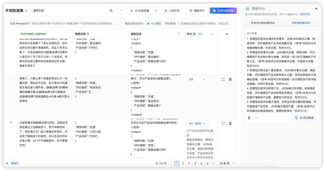 - 自动化评估与打分:PP将使用您的Prompt处理整个评测集,并根据您建立的标准,对每一个结果进行自动评分。