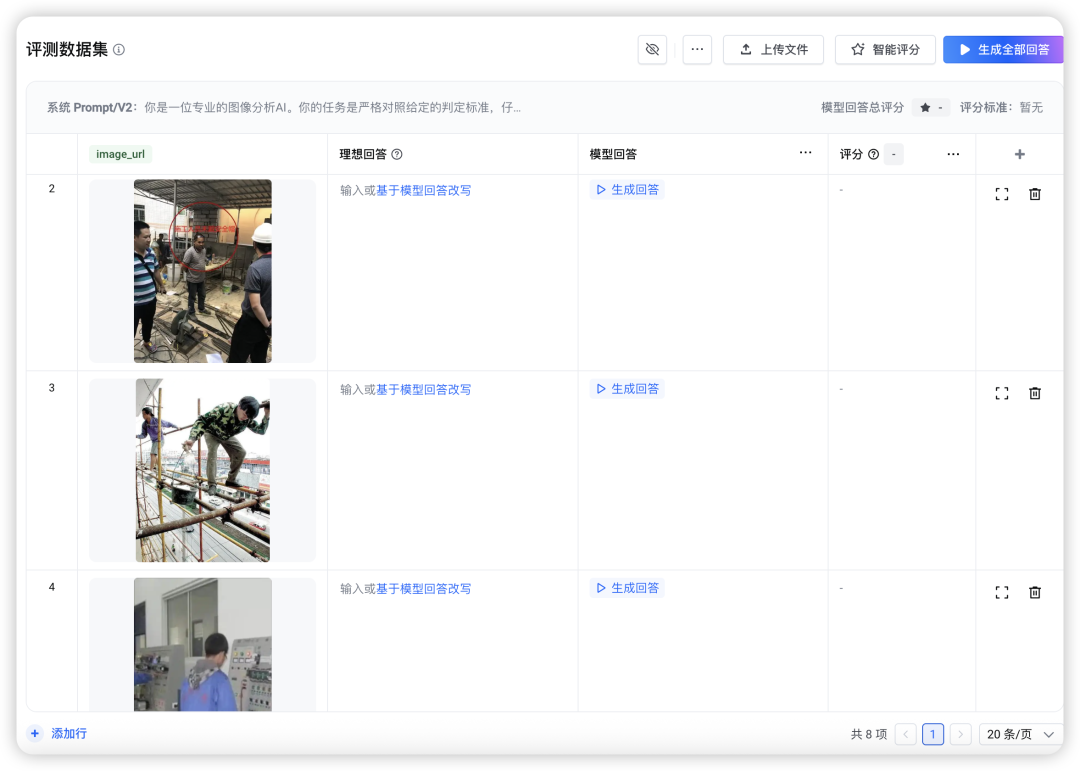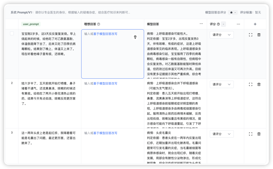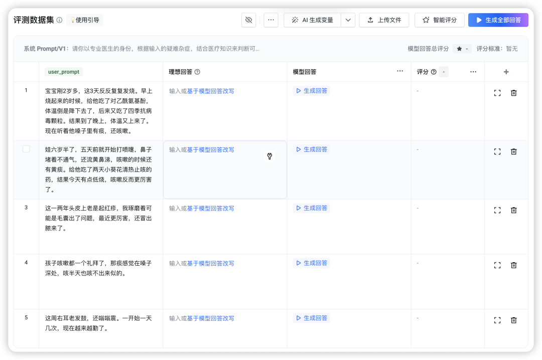 接着,继续可以进行批量评测和智能优化,上传case集,同时添加理想回答,给模型评分。
