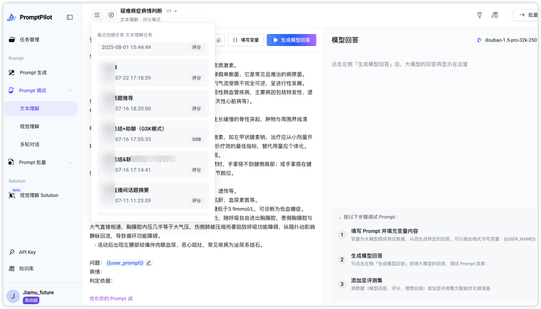 PromptPilot 是目前国内对外提供Prompt工程化应用实践的最好用的工具,它提供全流程智能优化,涵盖引导用户生成Prompt、根据内容进行调优、再到批量case评估prompt的各种边界,最后自动优化和管理Prompt全阶段。只有经历过全链路的测试之后,生成的Prompt,才能够投入到百万级请求的生产环境中。