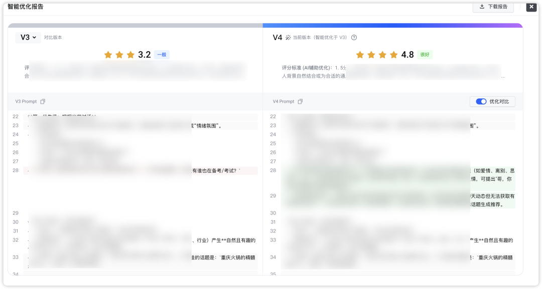 - 查看优化报告:优化完成后,平台会提供一份详细的对比报告,清晰展示新旧版本Prompt的综合得分对比(例如从3.2分提升至4.8分)、评分分布变化以及具体的Prompt修改内容,让每一次优化的效果都一目了然。