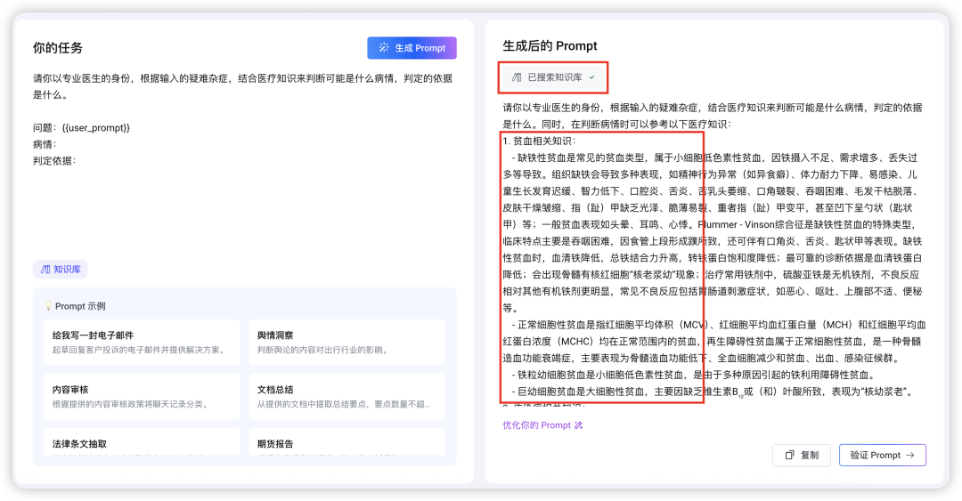 可以看到引入知识库后,生成的Prompt中按疾病进行分类,并增加了很多专业词汇。