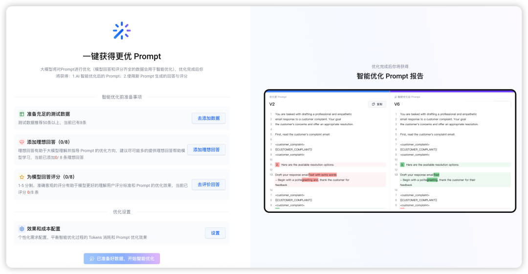 - 一键智能优化:基于带有评分的评测数据集,启动“智能优化”功能。PP会分析所有高分和低分案例,理解您的评估偏好和业务目标,然后自动进行多轮迭代,生成一个效果更好的新版Prompt。