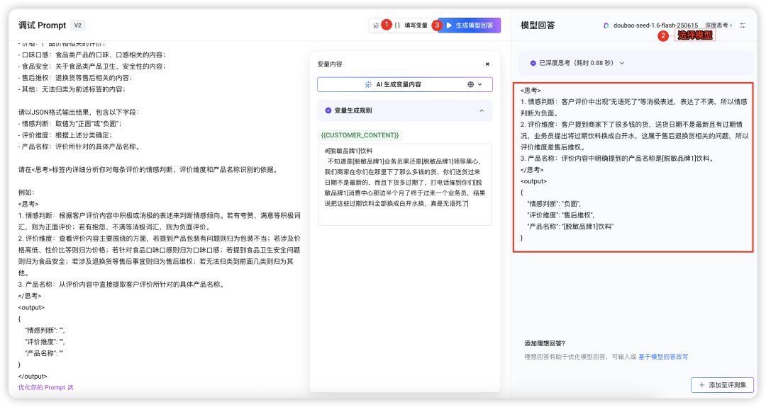 然后进行单点验证,在业务场景中,在变量处填入自己的真实数据,进行prompt调试,