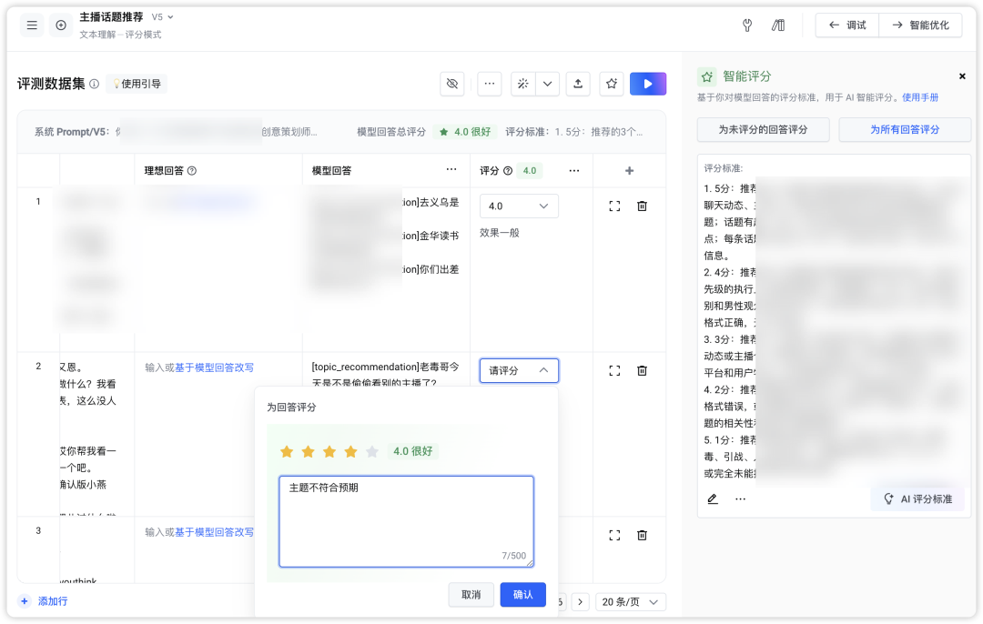 最终,您会得到一个关于当前Prompt版本的综合得分和详细的评分分布,让您对Prompt的整体表现有清晰、客观的认知(隐私原因暂不展示了)。