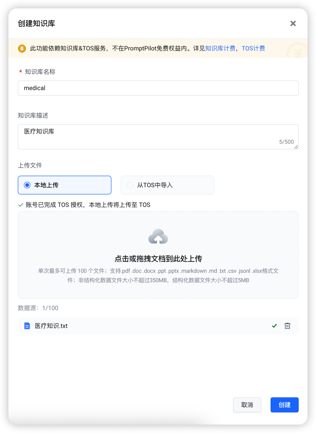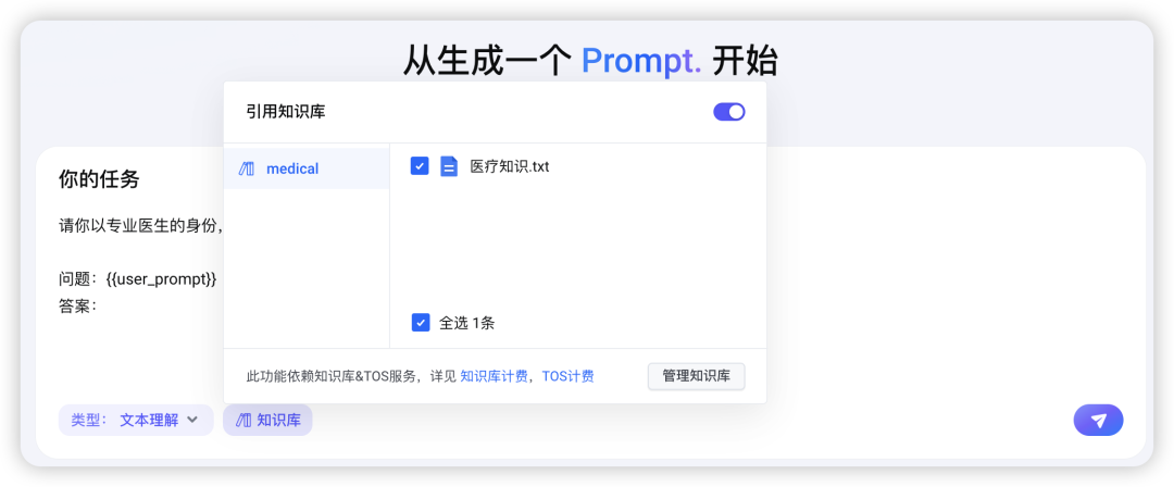 上传完成后,回到Prompt生成页面,输出需求并引用刚才上传的知识库。