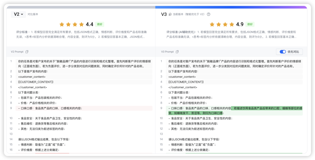 分析报告的结果中,它会根据我们的评分标准自动优化Prompt直到分数有明显提升。
