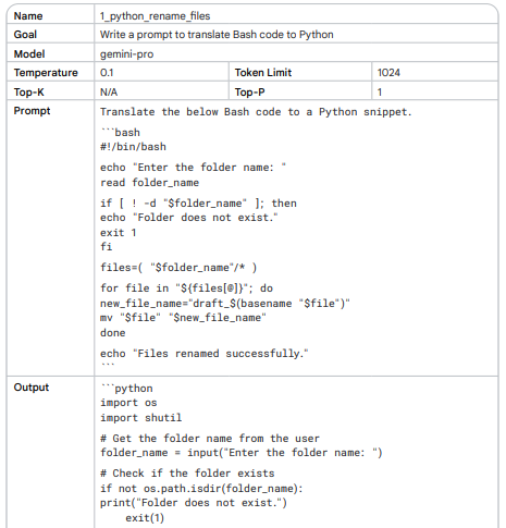 3)翻译代码的提示(Prompts for translating code)LLM可以帮助将代码从一种语言翻译到另一种语言。白皮书将上述Bash重命名脚本翻译成Python代码,这为开发者将脚本功能集成到具有UI的独立应用程序提供了起点。