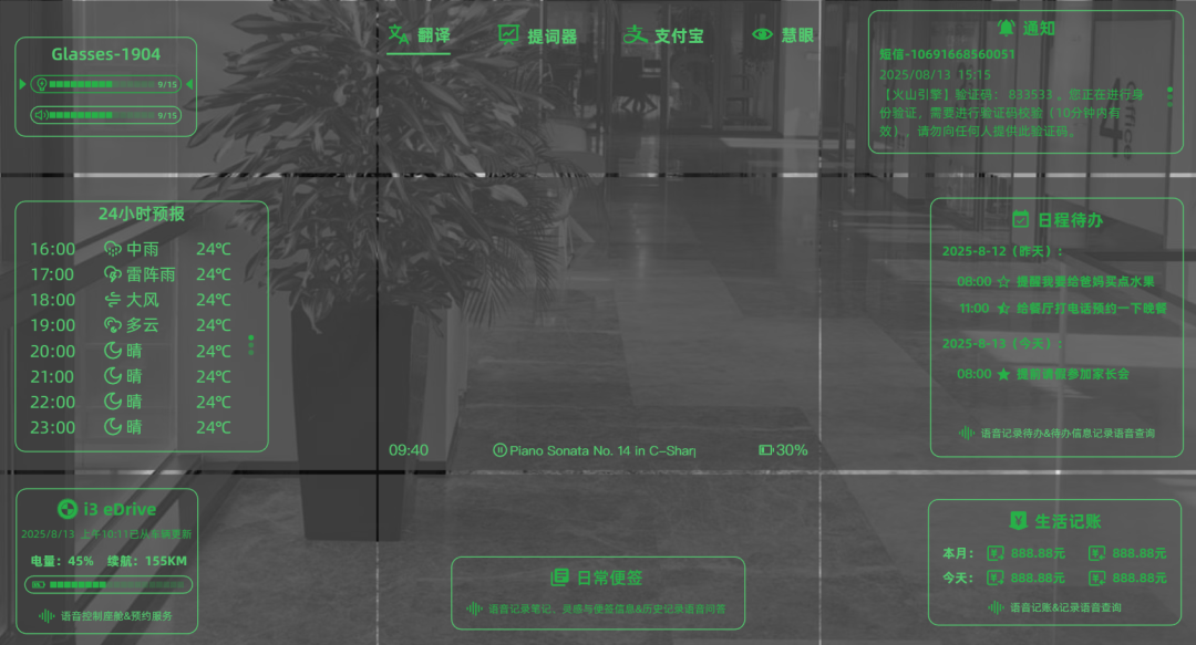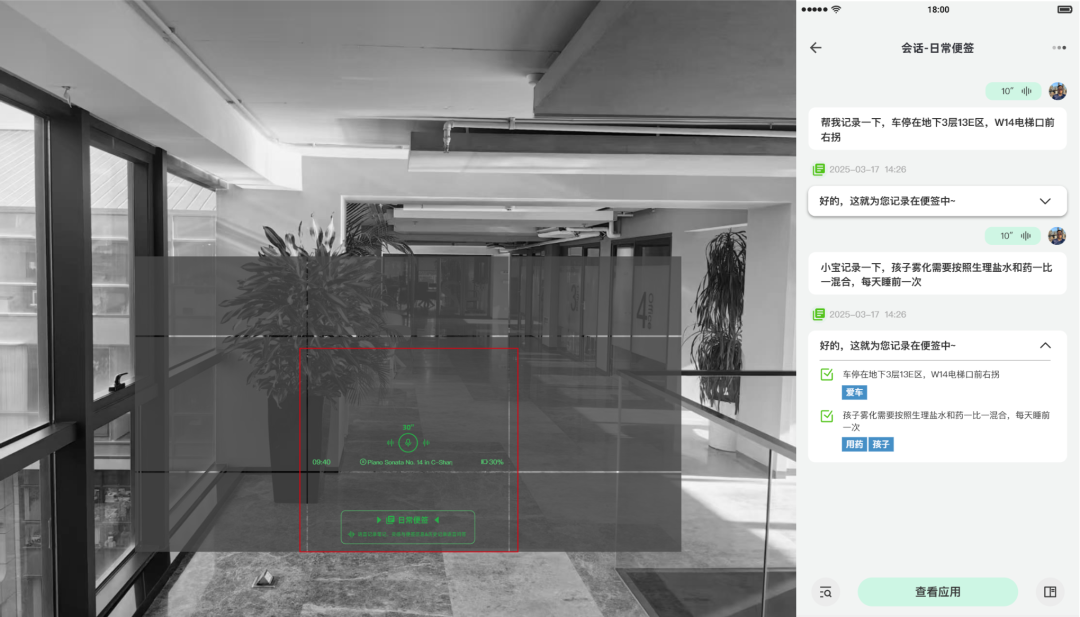 在录音状态下进行向下微转头,可在视野中看到“日常便签”,此时松手后将用户问询信息发送给该应用,应用处理的快回复信息有眼镜播放语音,后续处理可在App查看。