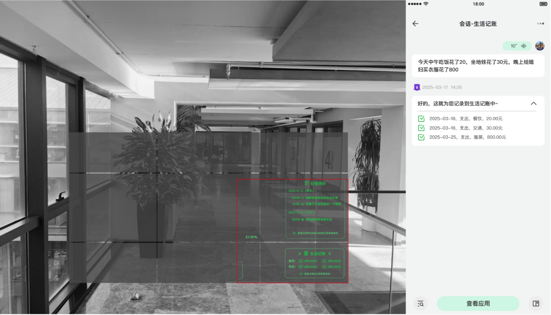 在录音状态下进行向右下微转头,可在视野中看到“生活记账”,此时松手后将用户问询信息发送给该应用,应用处理的快回复信息有眼镜播放语音,后续处理可在App查看。