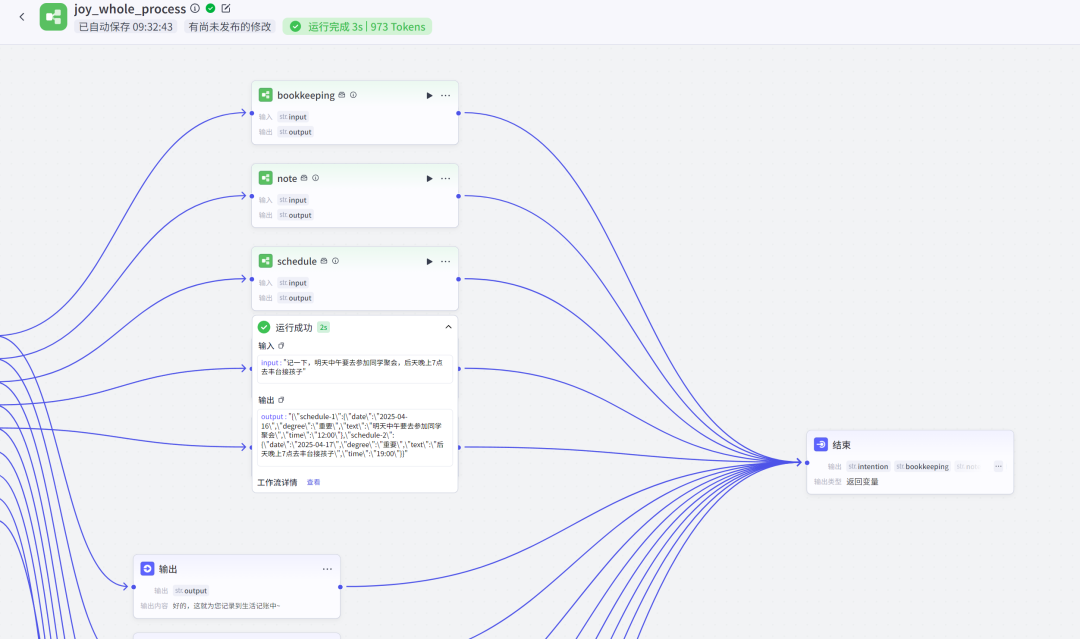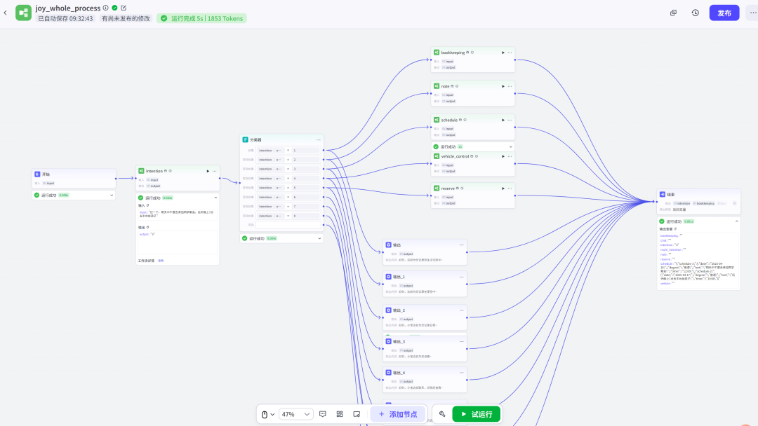 在目前的流程中,输入一个20个字左右的请求,选用最轻量级(最便宜,速度最快)的模型(Doubao-1.5-lite-32k),完成处理后会输出josn格式的数据,整体过程需要消耗1853个token,耗时为5s。