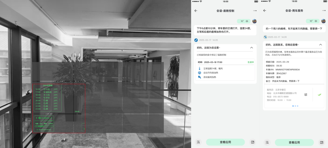在录音状态下进行向左下微转头,可以视野中看到“用车服务”,此时松手后将用户问询信息发送给该应用,应用可以进行车辆座舱控制或服务预约。