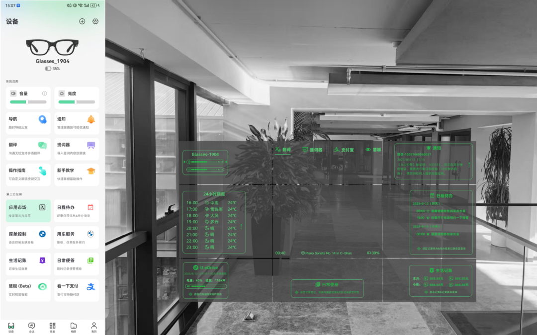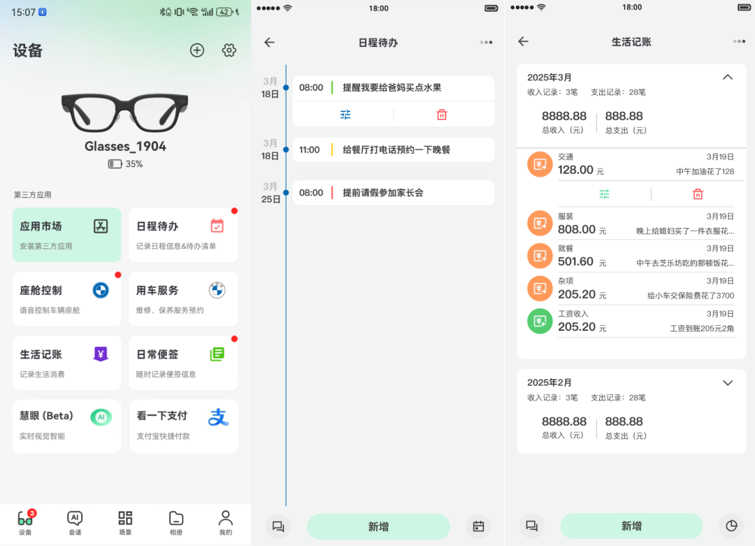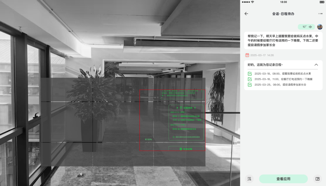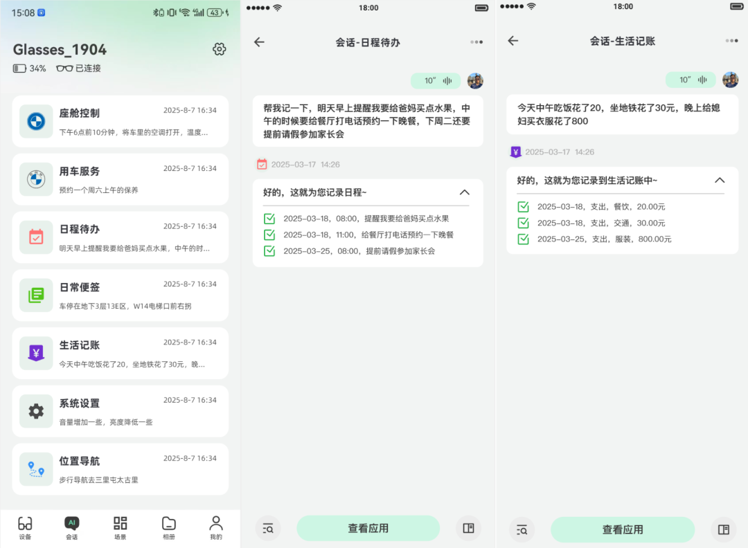 在录音状态下进行向右微转头,可以在视野中看到“日程待办”的应用组件(组件上显示三角标,表示预选中),此时“松手”,Glasses系统会将这段语音“发射”给“日程待办”应用(也开始先经过ASR转为文本,在调用应用接口)。接受到用户语音输入后,该应用需要进行处理,同时需要返回“好的,这就为您记录日程”这样的快回复文本,再由glasses的TTS转为语音并在眼镜中播放,应用对话过程及处理过程将会在App的“会话详情”页面中完整记录。