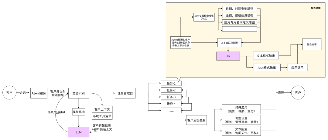 上图为乐奇智能体服务的一个极简流程图(预估),真实的流程服务会更为复杂,预计在任务调用之前还会进行用户自然语言改写、扩写,对于回复合规等问题也会有专门的模型服务进行处理;