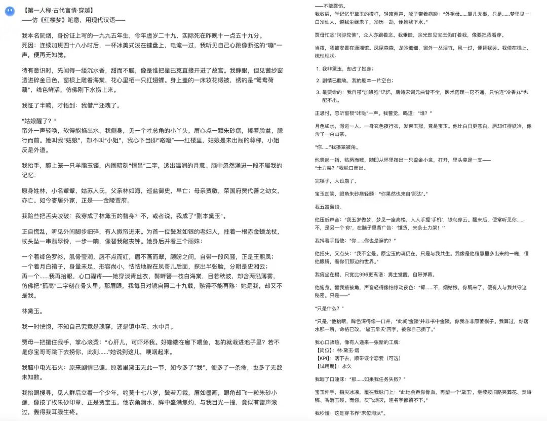 “提示词:你是一个知名的言情小说作家,请你模仿红楼梦的写作手法,以第一人称撰写一个古代言情穿越小说,使用现代文