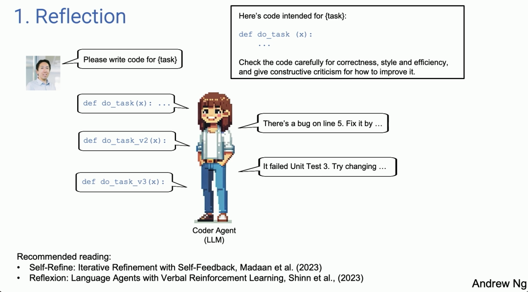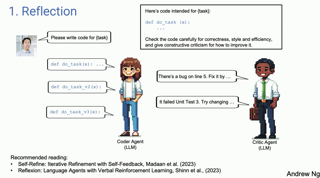 我认为这更多是一个新兴的领域,当我使用它们时,有时候我对它们的表现感到惊讶,但至少在此刻,我感觉我不能总是可靠地让它们工作。让我通过几个方面来讲解这四种设计模式。如果你们中的一些人回去自己尝试,或者让你们的工程师使用这些,我认为你们会很快获得生产力的提升。 关于Reflection,这里有个例子。比方说我让一个系统为我写代码完成一个给定的任务。然后我们有一个编码 Agent ,只是一个你提示写代码的 LLM ,比如说,“嘿,定义 doTask,像这样写一个函数。” 自我 Reflection 的一个例子可能是,如果你然后用类似这样的提示对 LLM 进行提示:“这里有一段代码是为了完成一个任务,只是把它们刚刚生成的完全相同的代码给它,然后说,仔细检查代码的正确性、效率、构造是否良好。只需要像这样写一个提示。” 结果可能是,你提示写代码的同一个 LLM ,可能能够发现诸如第 5 行的这个错误,并通过某种方式修复它。如果你现在拿它自己的反馈给它,并重新提示它,它可能会得出一个第二版本的代码,这个版本的代码可能比第一版本工作得更好。 不保证,但它经常足够有效,对很多应用来说值得一试,预示着如果你让它运行单元测试,如果它未通过单元测试,那么为什么会未通过单元测试?有那样的对话或许能弄清楚为什么未通过单元测试。所以试着改变一些东西,可能得到第三版本。 顺便说一下,对于那些想要了解更多这些技术的人,我对它们感到非常兴奋,对于四个部分中的每一个,我都在底部有一个推荐阅读部分,那里,包含了更多的参考资料。 再次预示,多 Agent 系统,我描述的是一个单独的代码 Agent ,你提示它进行自我对话。这个想法的一个自然演化是,不是一个单独的代码 Agent ,你可以有两个 Agent ,其中一个是代码 Agent ,另一个是批评 Agent 。这些可以是相同的基础 LLM ,但以不同的方式进行提示。我们说一个,你是专家级的代码撰写者,对吧?写代码。另一个说,你是专家级的代码审查者,审查这段代码。 这种工作流实际上很容易实现。我认为这是一种非常通用的技术,对许多工作流程而言。这将显著提高 LLM 的性能。 2.Tool Use