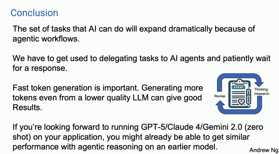 我认为,即使是来自稍微低质量的 LLM ,快速生成更多 token 也可能与来自更好 LLM 的慢 token 相比,获得好的结果。这可能有点争议,因为它可能让你更多次地绕这个循环,有点像我在第一张幻灯片上展示的 GPDC 和一个 Agent 架构的结果。 坦率地说,我非常期待 Claude5 和 Claude4,GPT-5 和 Gemini 2.0 以及所有这些你们正在构建的精彩模型。我部分感觉,如果你期待在 GPT-5 上运行你的东西,零次射击,你可能真的会在某些应用上获得比你想象的更接近那种水平的表现,通过 Agent 推理,但在一个早期模型上,我认为,这是一个重要趋势。 老实说,通往 AGI 的道路感觉像是一次旅程而非一个目的地,但我认为这种 Agent 工作流程可能帮助我们在这个非常长的旅程上向前迈出一小步。 |