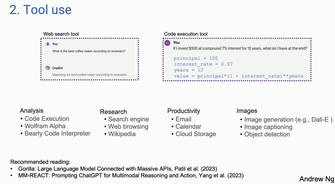 第二种设计模式是许多人已经看到的,基于 LLM 的系统使用的工具,左边是一个来自 Copilot 的截图。右边是我从 GPT-4 中提取的东西,但今天的 LLM ,如果你问它,什么是网上搜索中最好的咖啡机,对某些问题, LLM 会生成代码并运行代码。事实证明,有很多不同的工具被许多不同的人用于分析、获取信息、采取行动、个人生产力。 微软联合举办的生成式 AI 旧金山峰会 2024 火热来袭!RSVP 获行业领袖深度交流机会,文末领取专属九折优惠