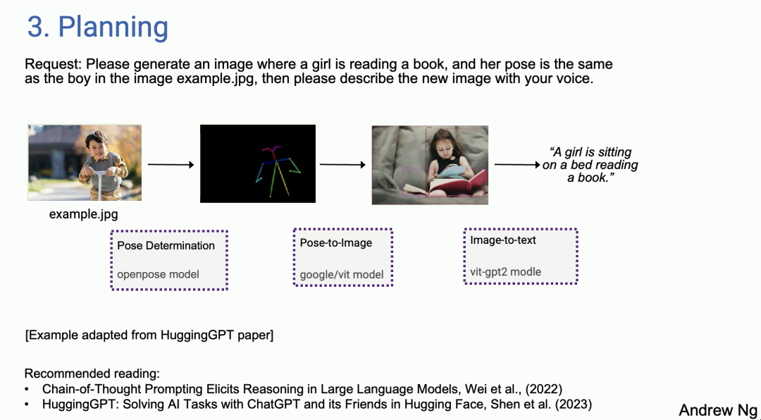 早期的工作转向使用,原来是在计算机视觉社区。因为在 LLM 之前,它们无法处理图像。所以唯一的选择是生成一个可以操纵图像的函数调用,比如生成一个图像或进行对象检测等。如果你实际上看看文献,很有趣的是,很多在使用方面的工作似乎都起源于视觉领域,因为在 GPT-4 等出现之前, LLM 对图像是盲目的,这就是使用,并扩展了 LLM 可以做的事情。 3.Planning