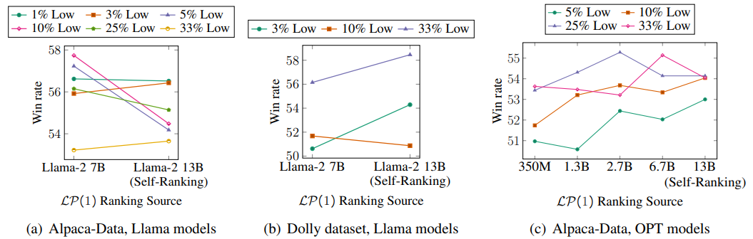 如下图展示了使用不同大小的OPT模型(350M, 1.3B, 2.7B, 6.7B)为13B模型选择训练数据时的胜率。结果显示,随着较小模型大小的增加,13B模型在选定数据上的性能提高。