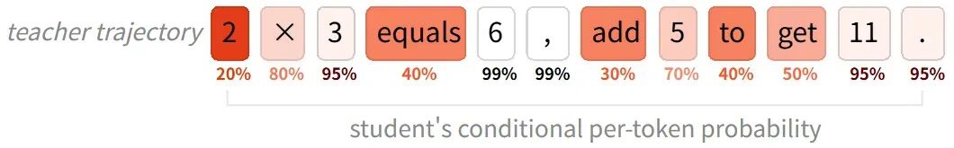在学习过程中,学生模型会对比教师的“标准答案”与“自己的预测”,并根据二者之间的差异(即自己生成该 Token 的概率有多低)来重点更新参数。