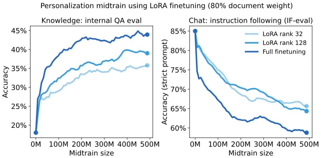 蒸馏的另一大用例是个性化。TML 展示了在策略内蒸馏如何解决“持续学习”中的“灾难性遗忘”问题。TML 希望模型首先能够掌握公司内部文档(知识,用“内部 QA”评估) ,其次保持强大的指令遵循能力(行为,用 IF-eval 评估)。