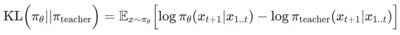 - 把学生的“答卷”提交给教师模型,教师过目一遍,给出它在_一模一样_的 token 上的“标准答案”分数。两者一减,前面提到的“反向 KL”奖励就到手了。