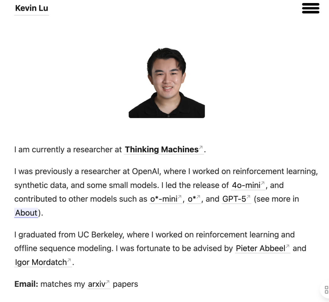 这篇博客的主要作者是前 OpenAI 研究员 Kevin Lu,与 Thinking Machines 团队合作完成,他曾领导 GPT-4o mini 发布,并参与了 o1-mini、o3、GPT-5 等多个重要模型的研发。他的出手,分量十足。