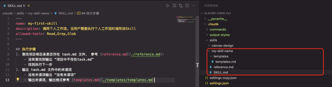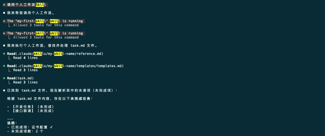 ---name:my-first-skilldescription:调用个人工作流。当用户需要执行个人工作流时调用该Skillallowed-tools:Read,Grep,Glob---##执行步骤1.查找项目根目录是否存在task.md文件,参考[reference.md](./reference.md):-没有查找到输出“项目中不存在task.md”-找到执行下一步2.输出task.md文件中的未读项-没有未读项输出“没有未读项”-输出未读项,输出格式参考[templates.md](./templates/templates.md) reference.md #task.md文件查找规则```bashfind.-name"task.md"``` templates.md #任务未读项格式-【任务1】(未完成)-【任务2】(未完成) 再次执行Skill任务,可以发现AI按照我们指定的规则输出了结果
