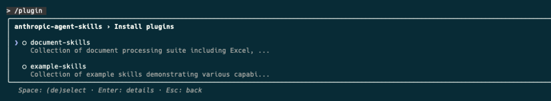 或者通过以下命令直接安装: /plugininstalldocument-skills@anthropic-agent-skills/plugininstallexample-skills@anthropic-agent-skills document-skills和example-skills包含的Skills如下所示: