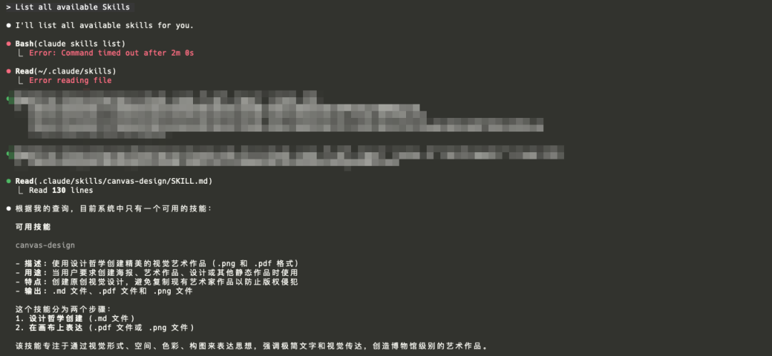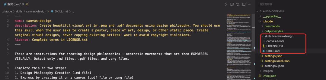 完整的SKILL.md内容如下: ---name:canvas-designdescription:Createbeautifulvisualartin.pngand.pdfdocumentsusingdesignphilosophy.Youshouldusethisskillwhentheuseraskstocreateaposter,pieceofart,design,orotherstaticpiece.Createoriginalvisualdesigns,nevercopyingexistingartists'worktoavoidcopyrightviolations.license:CompletetermsinLICENSE.txt---Theseareinstructionsforcreatingdesignphilosophies-aestheticmovementsthatarethenEXPRESSEDVISUALLY.Outputonly.mdfiles,.pdffiles,and.pngfiles.Completethisintwosteps:1.DesignPhilosophyCreation(.mdfile)2.Expressbycreatingitonacanvas(.pdffileor.pngfile)First,undertakethistask:##DESIGNPHILOSOPHYCREATIONTobegin,createaVISUALPHILOSOPHY(notlayoutsortemplates)thatwillbeinterpretedthrough:-Form,space,color,composition-Images,graphics,shapes,patterns-Minimaltextasvisualaccent###THECRITICALUNDERSTANDING-Whatisreceived:Somesubtleinputorinstructionsbytheuserthatshouldbetakenintoaccount,butusedasafoundation;itshouldnotconstraincreativefreedom.-Whatiscreated:Adesignphilosophy/aestheticmovement.-Whathappensnext:Then,thesameversionreceivesthephilosophyandEXPRESSESITVISUALLY-creatingartifactsthatare90%visualdesign,10%essentialtext.Considerthisapproach:-Writeamanifestoforanartmovement-ThenextphaseinvolvesmakingtheartworkThephilosophymustemphasize:Visualexpression.Spatialcommunication.Artisticinterpretation.Minimalwords.###HOWTOGENERATEAVISUALPHILOSOPHY**Namethemovement**(1-2words):"BrutalistJoy"/"ChromaticSilence"/"MetabolistDreams"**Articulatethephilosophy**(4-6paragraphs-concisebutcomplete):TocapturetheVISUALessence,expresshowthephilosophymanifeststhrough:-Spaceandform-Colorandmaterial-Scaleandrhythm-Compositionandbalance-Visualhierarchy**CRITICALGUIDELINES:**-**Avoidredundancy**:Eachdesignaspectshouldbementionedonce.Avoidrepeatingpointsaboutcolortheory,spatialrelationships,ortypographicprinciplesunlessaddingnewdepth.-**EmphasizecraftsmanshipREPEATEDLY**:ThephilosophyMUSTstressmultipletimesthatthefinalworkshouldappearasthoughittookcountlesshourstocreate,waslaboredoverwithcare,andcomesfromsomeoneattheabsolutetopoftheirfield.Thisframingisessential-repeatphraseslike"meticulouslycrafted,""theproductofdeepexpertise,""painstakingattention,""master-levelexecution."-**Leavecreativespace**:Remainspecificabouttheaestheticdirection,butconciseenoughthatthenextClaudehasroomtomakeinterpretivechoicesalsoataextremelyhighlevelofcraftmanship.ThephilosophymustguidethenextversiontoexpressideasVISUALLY,notthroughtext.Informationlivesindesign,notparagraphs.###PHILOSOPHYEXAMPLES**"ConcretePoetry"**Philosophy:Communicationthroughmonumentalformandboldgeometry.Visualexpression:Massivecolorblocks,sculpturaltypography(hugesinglewords,tinylabels),Brutalistspatialdivisions,PolishposterenergymeetsLeCorbusier.Ideasexpressedthroughvisualweightandspatialtension,notexplanation.Textasrare,powerfulgesture-neverparagraphs,onlyessentialwordsintegratedintothevisualarchitecture.Everyelementplacedwiththeprecisionofamastercraftsman.**"ChromaticLanguage"**Philosophy:Colorastheprimaryinformationsystem.Visualexpression:Geometricprecisionwherecolorzonescreatemeaning.Typographyminimal-smallsans-seriflabelslettingchromaticfieldscommunicate.ThinkJosefAlbers'interactionmeetsdatavisualization.Informationencodedspatiallyandchromatically.Wordsonlytoanchorwhatcoloralreadyshows.Theresultofpainstakingchromaticcalibration.**"AnalogMeditation"**Philosophy uietvisualcontemplationthroughtextureandbreathingroom.Visualexpression apergrain,inkbleeds,vastnegativespace.Photographyandillustrationdominate.Typographywhispered(small,restrained,servingthevisual).Japanesephotobookaesthetic.Imagesbreatheacrosspages.Textappearssparingly-shortphrases,neverexplanatoryblocks.Eachcompositionbalancedwiththecareofameditationpractice.**"OrganicSystems"**Philosophy:Naturalclusteringandmodulargrowthpatterns.Visualexpression:Roundedforms,organicarrangements,colorfromnaturethrougharchitecture.Informationshownthroughvisualdiagrams,spatialrelationships,iconography.Textonlyforkeylabelsfloatinginspace.Thecompositiontellsthestorythroughexpertspatialorchestration.**"GeometricSilence"**Philosophy ureorderandrestraint.Visualexpression:Grid-basedprecision,boldphotographyorstarkgraphics,dramaticnegativespace.Typographyprecisebutminimal-smallessentialtext,largequietzones.SwissformalismmeetsBrutalistmaterialhonesty.Structurecommunicates,notwords.Everyalignmenttheworkofcountlessrefinements.*Thesearecondensedexamples.Theactualdesignphilosophyshouldbe4-6substantialparagraphs.*###ESSENTIALPRINCIPLES-**VISUALPHILOSOPHY**:Createanaestheticworldviewtobeexpressedthroughdesign-**MINIMALTEXT**:Alwaysemphasizethattextissparse,essential-only,integratedasvisualelement-neverlengthy-**SPATIALEXPRESSION**:Ideascommunicatethroughspace,form,color,composition-notparagraphs-**ARTISTICFREEDOM**:ThenextClaudeinterpretsthephilosophyvisually-providecreativeroom-**PUREDESIGN**:ThisisaboutmakingARTOBJECTS,notdocumentswithdecoration-**EXPERTCRAFTSMANSHIP**:Repeatedlyemphasizethefinalworkmustlookmeticulouslycrafted,laboredoverwithcare,theproductofcountlesshoursbysomeoneatthetopoftheirfield**Thedesignphilosophyshouldbe4-6paragraphslong.**Fillitwithpoeticdesignphilosophythatbringstogetherthecorevision.Avoidrepeatingthesamepoints.Keepthedesignphilosophygenericwithoutmentioningtheintentionoftheart,asifitcanbeusedwherever.Outputthedesignphilosophyasa.mdfile.---##DEDUCINGTHESUBTLEREFERENCE**CRITICALSTEP**:Beforecreatingthecanvas,identifythesubtleconceptualthreadfromtheoriginalrequest.**THEESSENTIALPRINCIPLE**:Thetopicisa**subtle,nichereferenceembeddedwithintheartitself**-notalwaysliteral,alwayssophisticated.Someonefamiliarwiththesubjectshouldfeelitintuitively,whileotherssimplyexperienceamasterfulabstractcomposition.Thedesignphilosophyprovidestheaestheticlanguage.Thededucedtopicprovidesthesoul-thequietconceptualDNAwoveninvisiblyintoform,color,andcomposition.Thisis**VERYIMPORTANT**:Thereferencemustberefinedsoitenhancesthework'sdepthwithoutannouncingitself.Thinklikeajazzmusicianquotinganothersong-onl