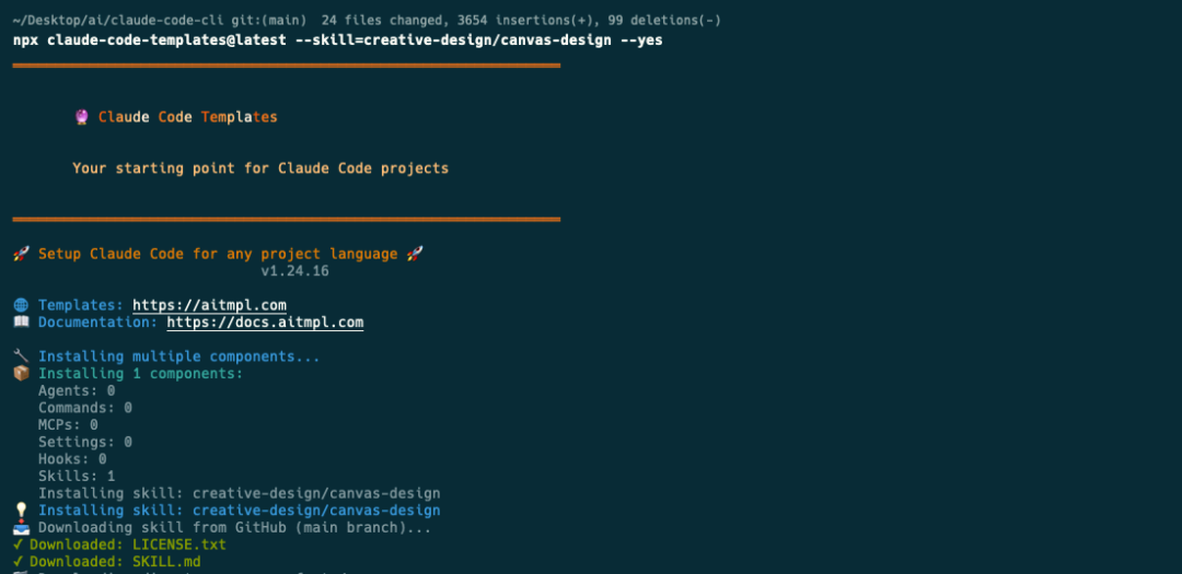 三方Skill安装使用 这里以Claude Code Templates提供的Skills为例,对Claude Code Templates还不了解的小伙伴可以看往期内容:分享一个Claude Code宝藏网站Claude Code Templates 进入项目根目录,在命令行终端输入如下指令进行安装: $npxclaude-code-templates@latest--skill=creative-design/canvas-design--yes