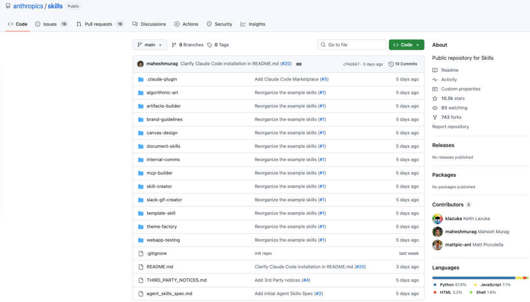 Anthropic提供了一系列Skill示例,部分已经集成到了Claude Code桌面端,也可以在Claude Code CLI中使用,感兴趣的小伙伴可以自行了解。 Github地址:https://github.com/anthropics/skills