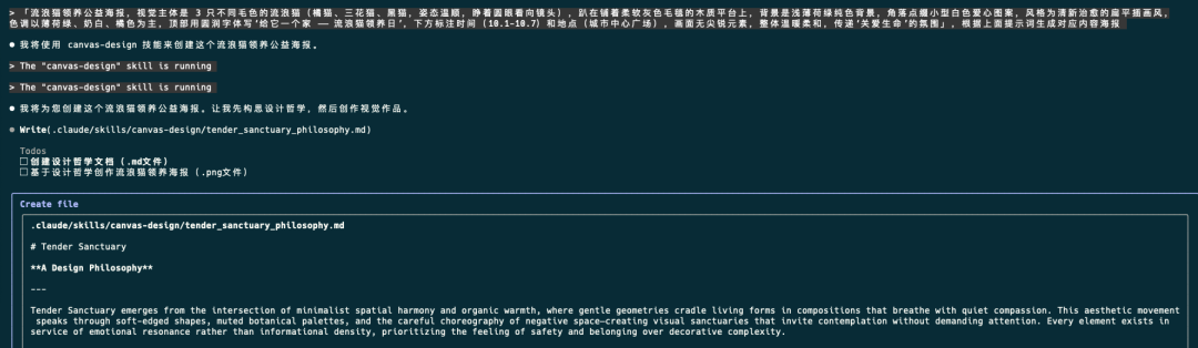 Skill的使用也很简单,直接输入提示词: 「流浪猫领养公益海报,视觉主体是3只不同毛色的流浪猫(橘猫、三花猫、黑猫,姿态温顺,睁着圆眼看向镜头),趴在铺着柔软灰色毛毯的木质平台上,背景是浅薄荷绿纯色背景,角落点缀小型白色爱心图案,风格为清新治愈的扁平插画风,色调以薄荷绿、奶白、橘色为主,顶部用圆润字体写‘给它一个家——流浪猫领养日’,下方标注时间(10.1-10.7)和地点(城市中心广场),画面无尖锐元素,整体温暖柔和,传递‘关爱生命’的氛围」,根据上面提示词生成对应内容海报 Claude Code CLI会根据Skill要求先进行设计哲学创作并保存到tender_sanctuary_philosophy.md文件