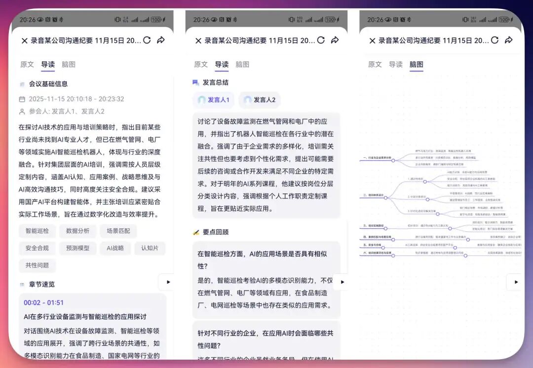 等你会议结束后会给你生成导读(基础信息、发言总结)快速帮你生成概要,还给你一份脑图,方便你进行事后回顾。