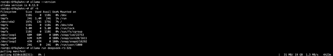 2、下载运行deepseek-r1:32b我这里使用的是32b的模型,大约20个G,进行本地研究应该是足够了,同时保证内存和磁盘空间足够。  ollama默认模型放置路径为/usr/share/ollama/.ollama/models