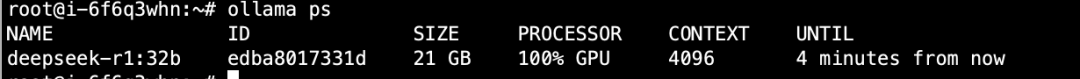 安装完成开始运行,使用命令ollama ps可以看到deepseek-r1:32b完全运行在GPU上。GPU使用的是2张A10 NVIDIA卡。提个问题试试。  回复测试没问题。回复/bye或者按Ctrl+D退出。