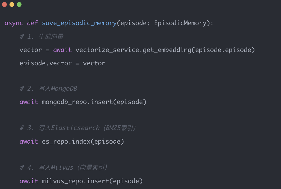 这种设计使得检索结果不再是碎片化的文本块,而是语义完整、结构化的记忆片段。 二、系统架构:四数据库协同设计 EverMemOS采用多数据库协同架构,每个数据库承担特定职责: 2.1 三重写入策略 核心记忆类型(Episode、Profile等)采用同步写入MongoDB、Elasticsearch和Milvus: 优势: - MongoDB:灵活的文档存储,支持复杂查询和事务