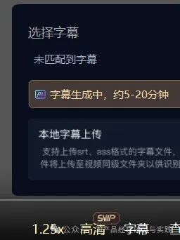 智能助理支持根据视频自动生成字幕和文稿。这一功能在如Youtube、B站等视频平台上早已司空见惯,然而在百度网盘中体验却有所不同。我注意到,每当我尝试生成字幕或文稿时,系统会提示需要等待几分钟。起初,这种等待与即时展现的字幕形成了鲜明对比,引起了我的好奇。