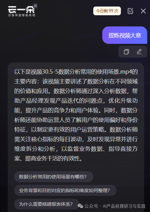 在这种情景下,我们可以把它理解为带有知识库的GPTs(即ChatGPT+网盘内容资源),它既可以针对指定的视频进行智能对话交互,也可以进一步联网扩展获取补充信息。