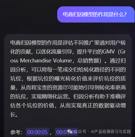 如果我们直接针对视频发起相关提问,智能助理除了会结合视频内容做出回复之外,还会指出对应内容出现在视频中的位置(这个就和B站的功能相似了,不过更接近于我们此前分析过的腾讯会议的章节标注功能)。