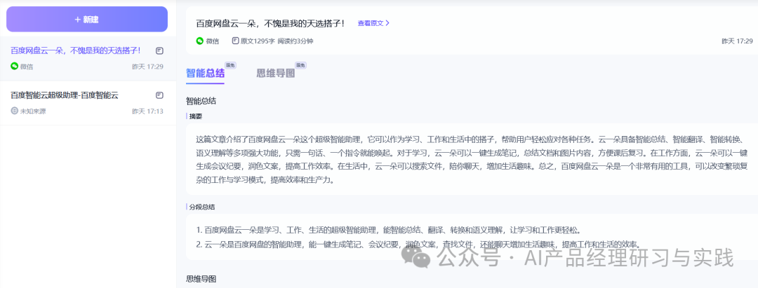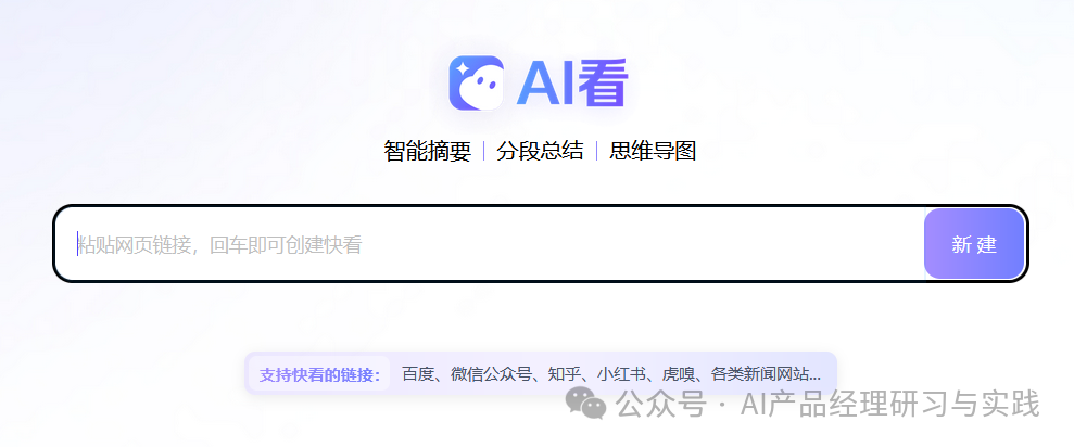 AI看功能,支持用户通过简单地粘贴网页链接,就能够快速创建“快看”,这一过程涉及到智能摘要的生成、信息的分段总结,以及思维导图的创建。